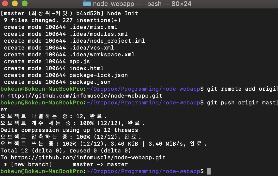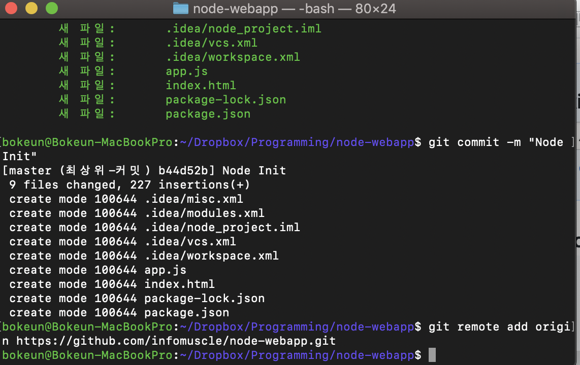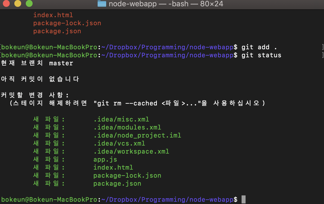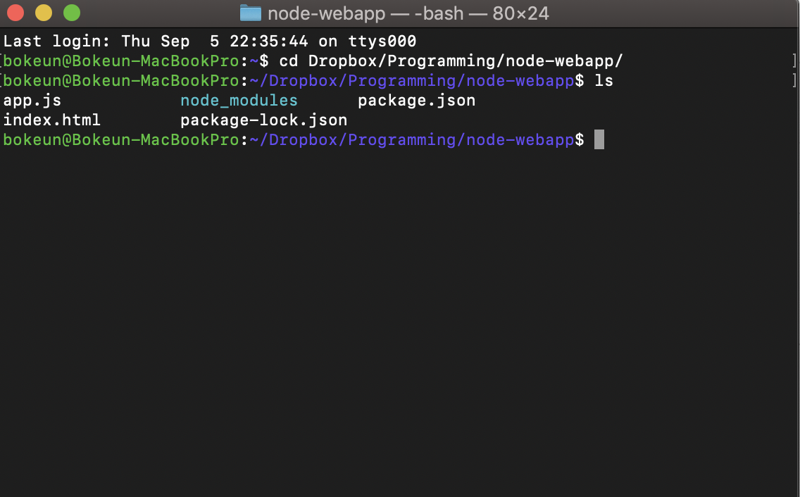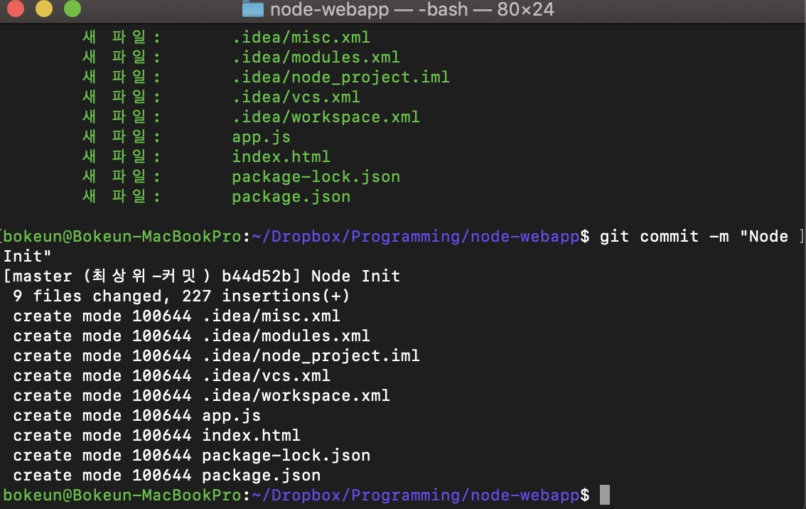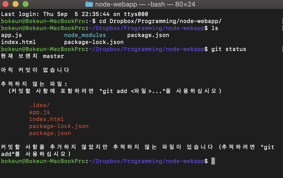 우선 터미널(윈도우의 경우 Git CMD)을 켜고 생성한 프로젝트 폴더로 이동한다. 내가 연습에 쓰는 프로젝트는 'node-webapp'이며, Dropbox/Programming 경로에 있다. "cd [프로젝트 경로]" 명령어를 쳐서 해당 경로로 이동한다.