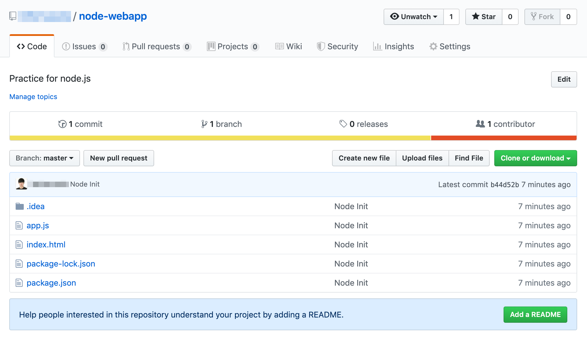 작업한 파일들이 올라간 것을 확인할 수 있다. 그리고 'Node Init'이란 문구에서 볼 수 있듯이, 해당 파일이 마지막으로 변경된 커밋의 설명을 확인할 수 있다. 언제 이 파일이 어떻게 변경됐는지의 최신 상태를 간단히 볼 수 있는 것이다.