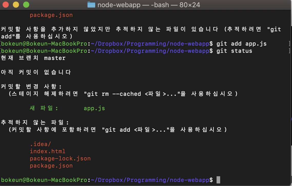 "git add" 명령어를 사용한다. 다만 이 때 옵션이 있는데, 추적할 파일명을 add 뒤에 적어줘야 한다. "git add [파일명]" 이런 식. "git add app.js"를 친 후, git status로 현재 상태를 확인해보았다. '커밋할 변경 사항'으로 app.js만 초록색으로 바뀌었다.