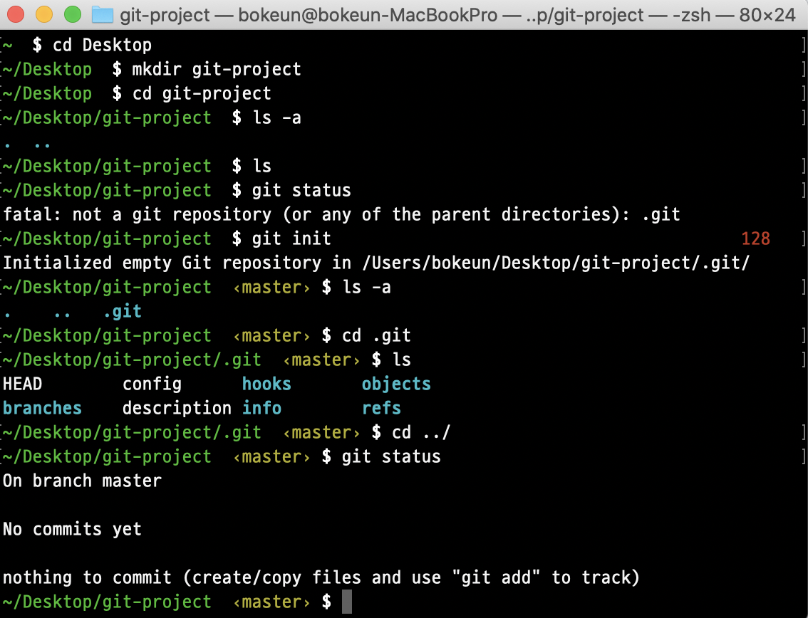그럼 git init 명령어를 입력하겠습니다. Initialized로 시작하는 문구가 뜹니다. 깃 프로젝트를 초기화 했다는 의미입니다. 이제 다시 ls -a를 입력해보겠습니다. 앞서 확인했던 .와 ..외에 .git으로 시작되는 디렉토리가 생겼음을 확인할 수 있습니다. 프로젝트의 버전 관리를 담당하는 파일들이 들어있는 디렉토리입니다. 맥 파인더에서 git-project 디렉토리로 들어가도 아무 것도 보이지 않을 것입니다. 앞서 말했듯이 .이 앞에 붙은 파일/디렉토리는 숨김처리 되어있는 파일/디렉토리이기 때문입니다. 파인더 설정에서 숨김 보기 설정을 바꾸시면 .git 디렉토리를 확인하실 수 있습니다.