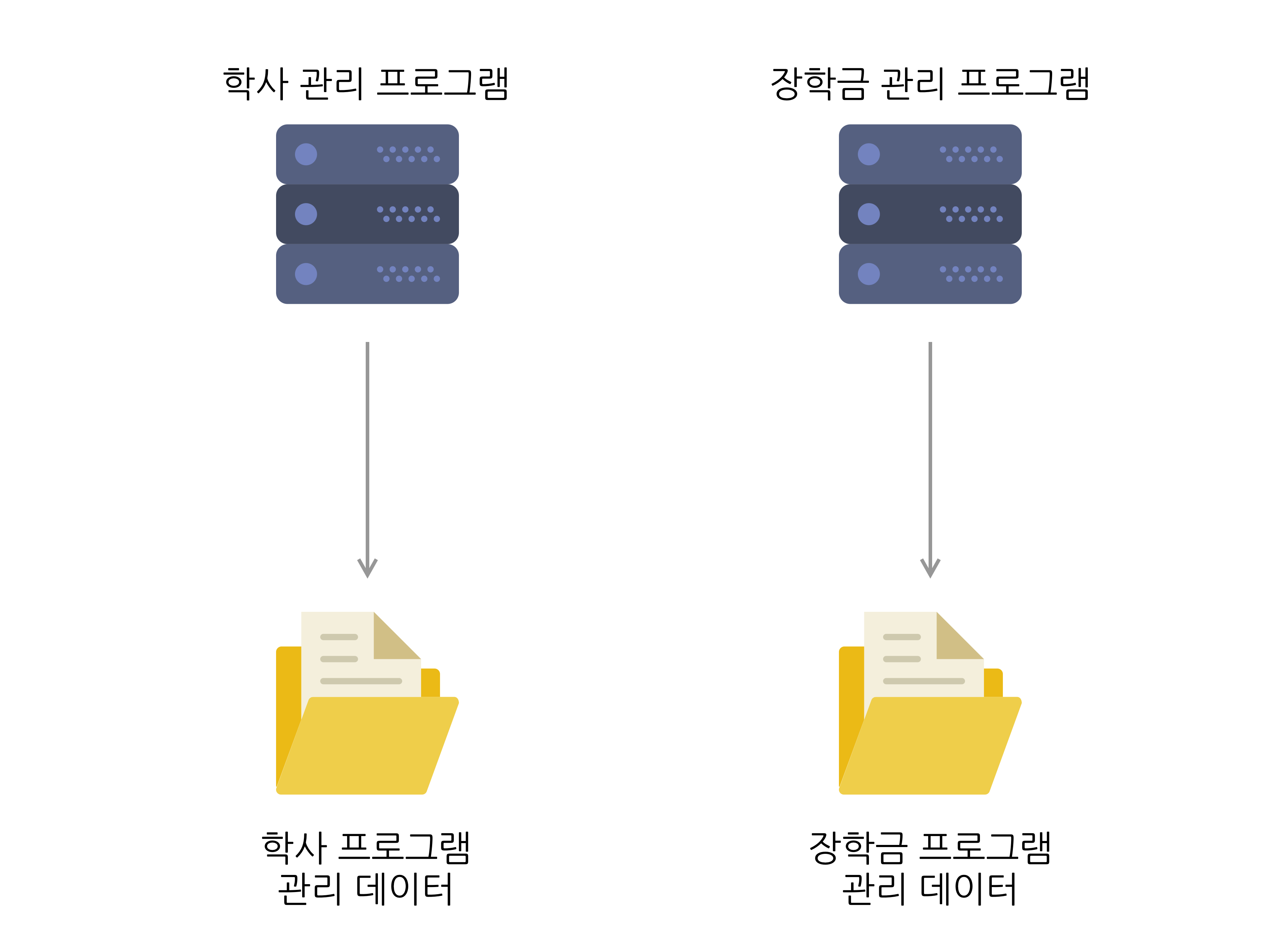 - 각 프로그램 간 데이터에 연관이 없고 중복 및 누락 발생 가능