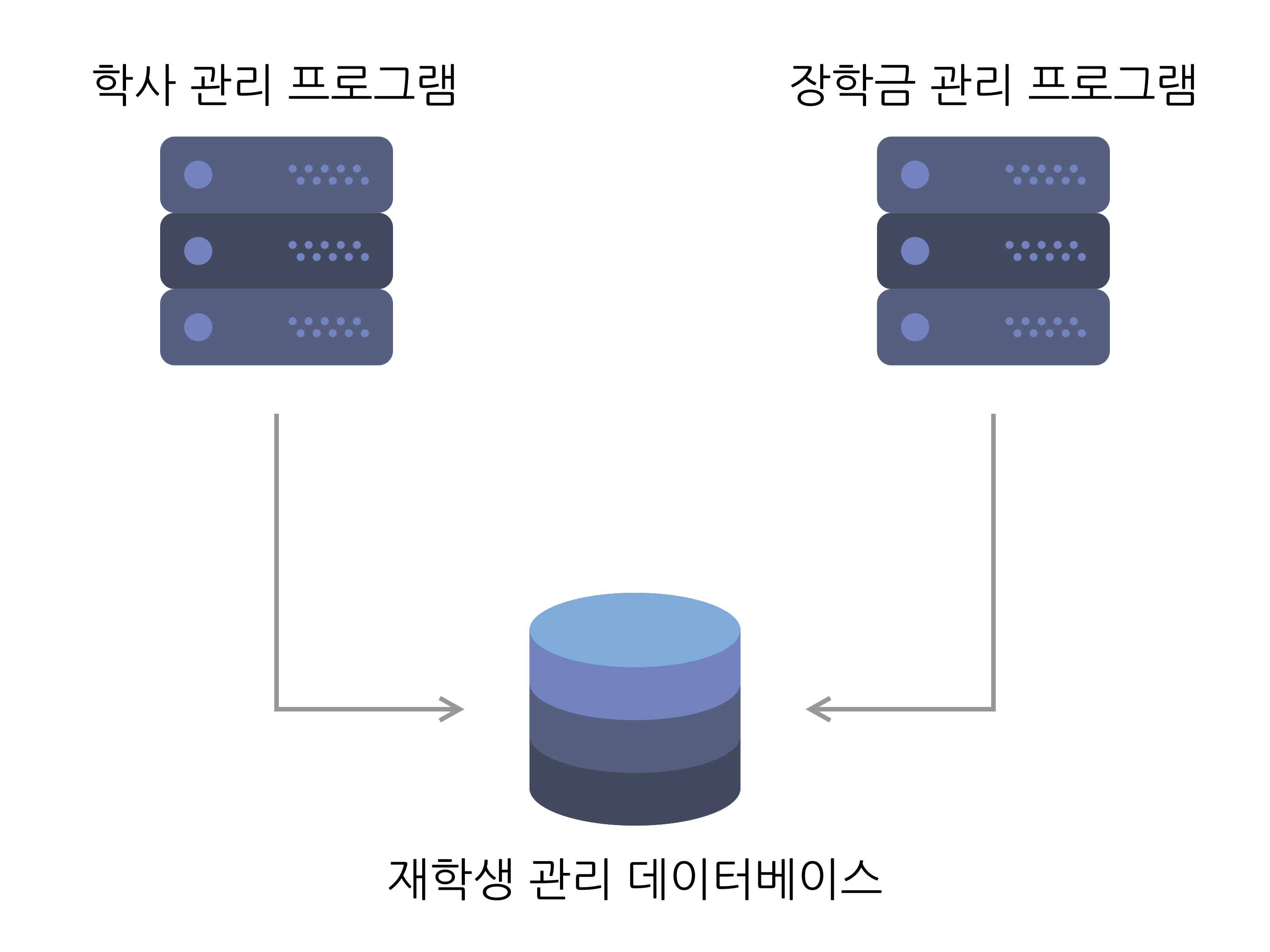 학사 프로그램에서 데이터베이스의 A 학생을 졸업 처리한다면 A 학생은 장학금을 받을 수 없다. 장학금 프로그램에서는 장학금 테이블과 학적 테이블을 조인하여, 졸업 상태인 학생을 제외하고 장학금 신청 가능 대상을 조회할 수 있다.서비스의 역할 분담