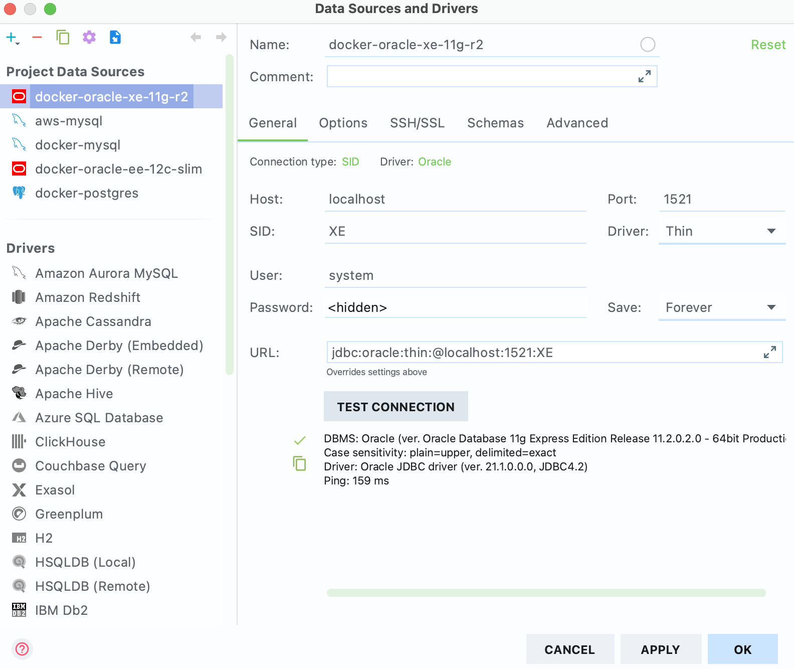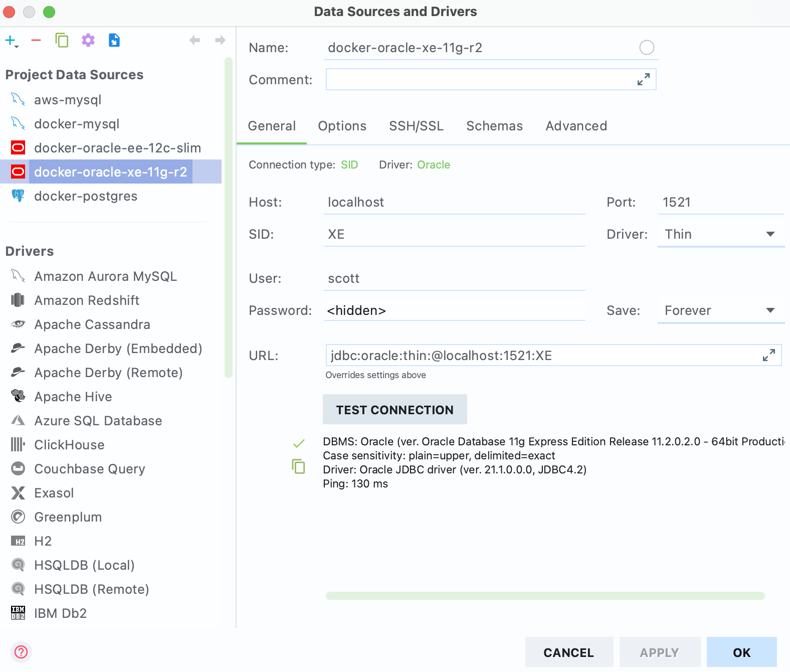 어찌 된 일인지 이렇게 생성된 오라클 컨테이너의 DBA_USERS 테이블을 살펴보면 SCOTT 계정이 없다. 다른 이미지도 받아보고, 열심히 알아봤지만 그냥 SCOTT 계정을 직접 생성하는 게 낫다고 판단했다. 작업을 쉽게 하기 위해 우선 Datagrip에 접속한다.