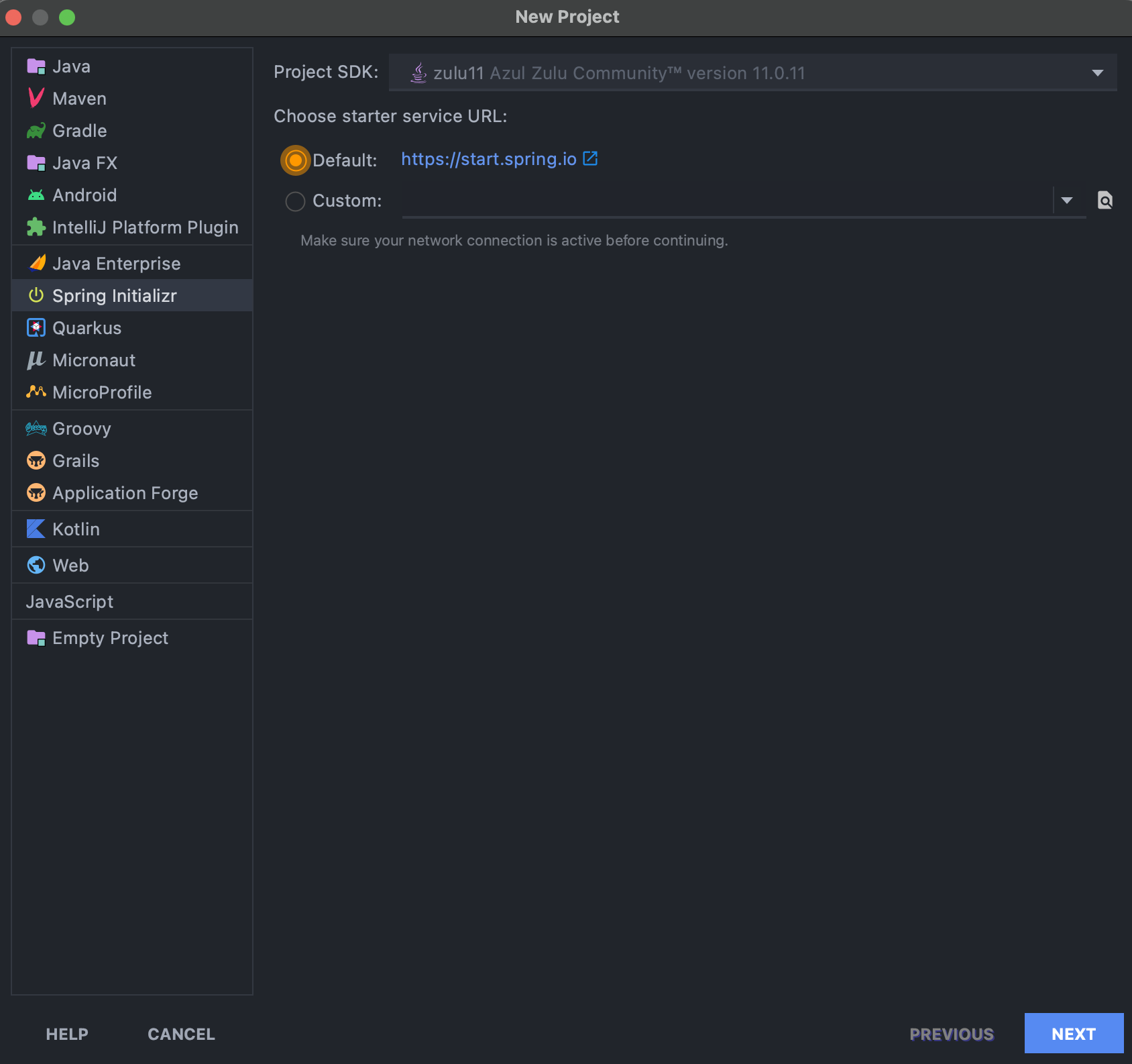 Spring Initializr선택 Project SDK에서 원하는 버전 선택- Default 선택 후
