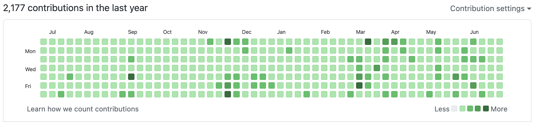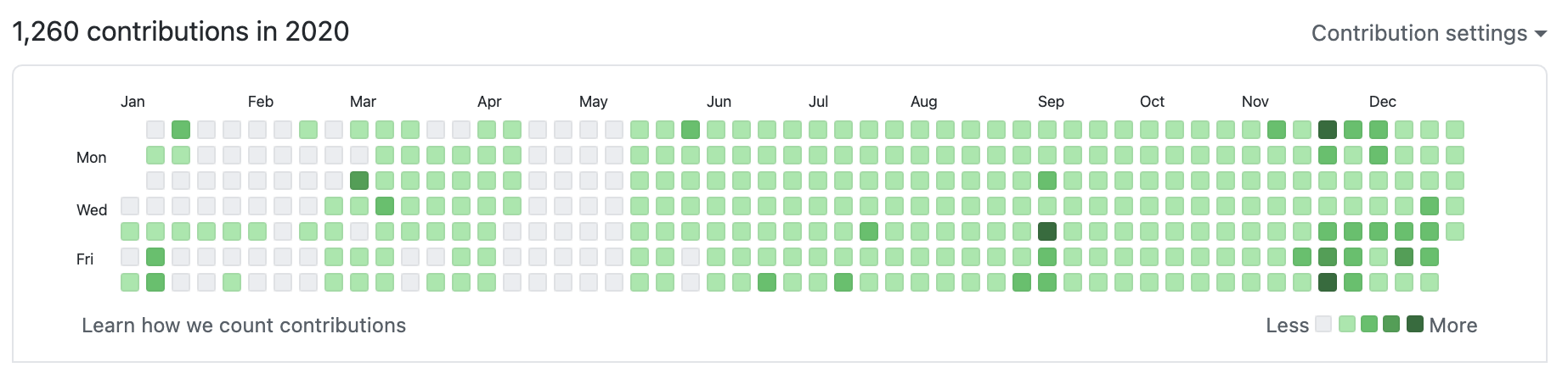 2018년에 깃허브의 '잔디밭'이라는 걸 처음 들었을 때부터 한 번 해보고 싶었다. 몇 번 시도해봤지만 쉽지는 않았다. 그러나 결국 성공했고, 1년하고 한 달만에 프로젝트(?)를 종료하게 되었다. 그리고 정리해보는 회고록.