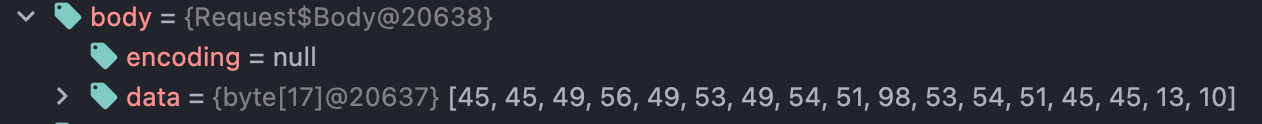 MultipartFormContentProcessor.process()는 data로 결국 빈 HashMap을 받는다. 요청 데이터는 못 넣고, boundary의 끝 부분만 넣게된다. 이걸 바이트 배열로 변환해서 body에 넣게 되는 것이다. 그래서 로그에서는 Content-Length가 17, Body는 Binary data라고 찍혔던 것이다.