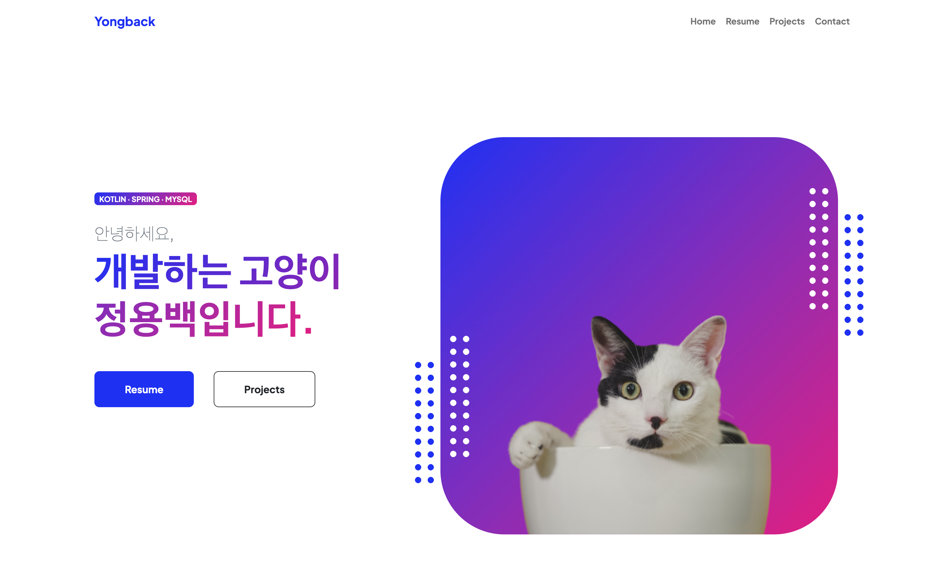 이론부터 실습까지. 직접 개발한 웹사이트를 클라우드에 올리며 웹 개발 전반을 학습할 수 있습니다., [사진]개발자 고양이 용백이의 가상 프로필로 만든 포트폴리오 사이트Kotlin과 Spring Boot으로
